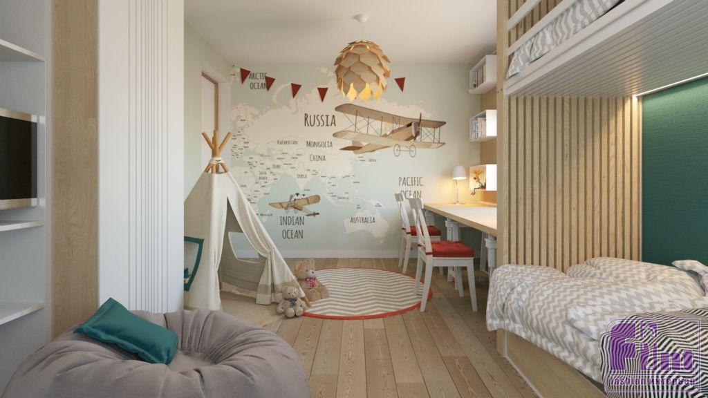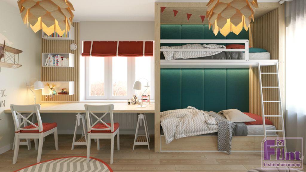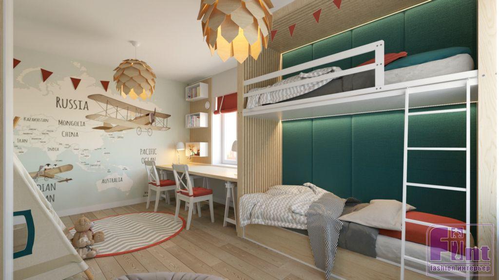 Для детской комнаты авторы проекта разработали двухуровневую конструкцию из наборных ламелей - кровать с выдвижными ящиками для белья внизу и игровую зону — вверху.