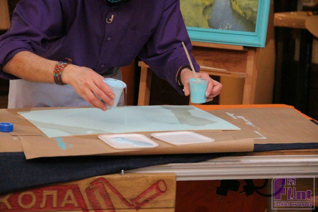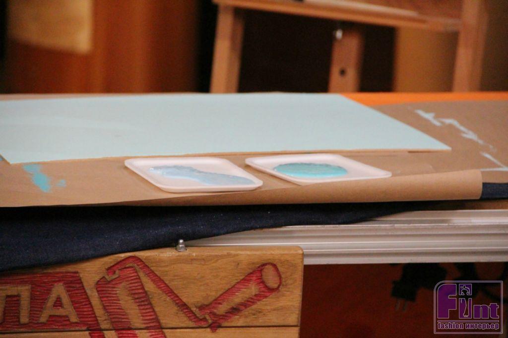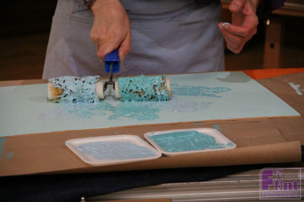 Основу для подноса из МДФ покрываем грунтовочным составом, заколерованным в нужный цвет (под цвет рамы). Затем, после полного высыхания грунтовки, приступаем к декорированию. Для чего наливаем в две ёмкости краску двух оттенков (в нашем случае – это голубая краска). Затем особым двойным валиком хаотичными движениями наносим краску на загрунтованную поверхность основания подноса.
