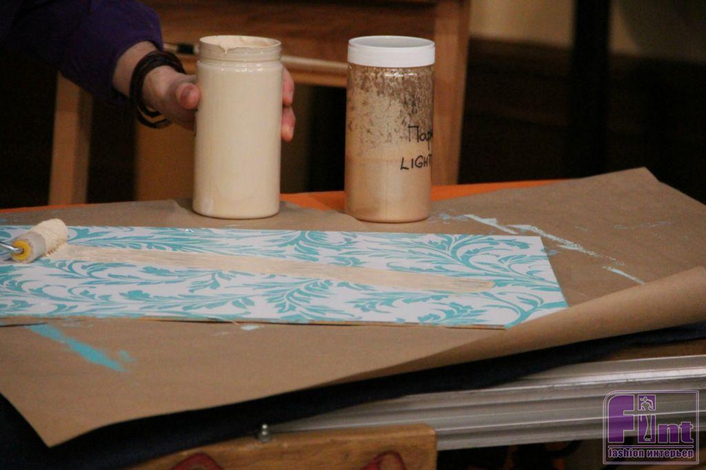 Наносим трафарет на просохшую поверхность основания подноса. Поверхность трафарета закрашиваем базовой краской бежевого оттенка, а после высыхания слоя краски, наносим золотую краску, напоминающую богатую парчовую ткань.