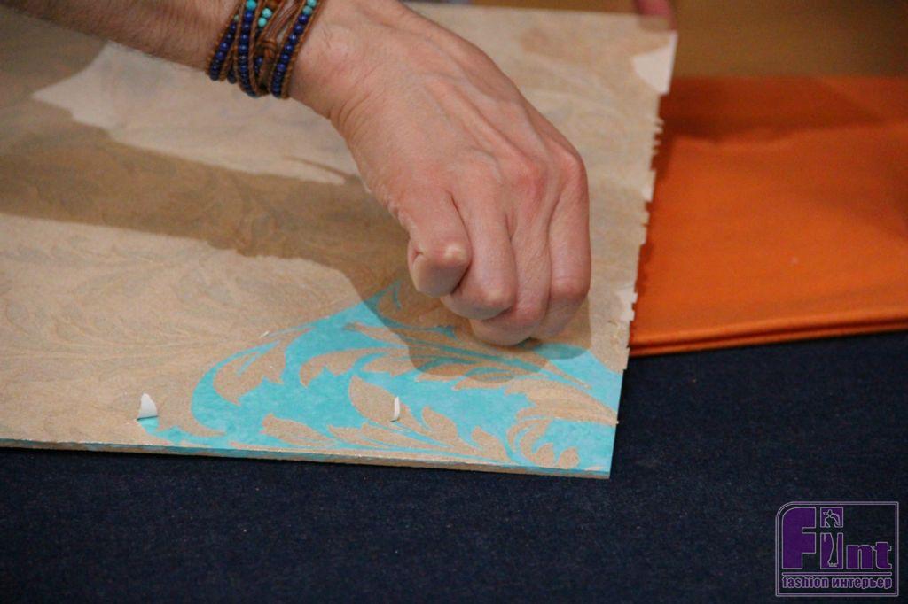 Снимаем трафарет с окрашенной и высохшей поверхности и вставляем задекорированное основание в раму. С обратной стороны пристреливаем степлером еще один лист МДФ — для надежности и прочности конструкции.