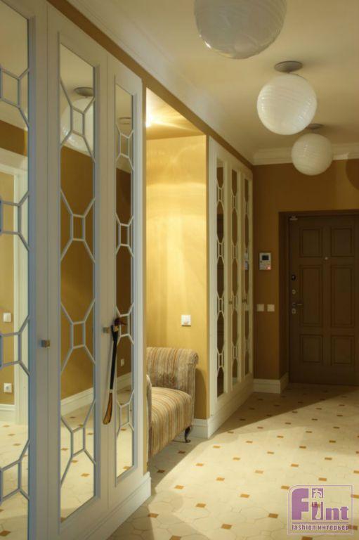 Стены в коридоре покрасили в цвет глубокого янтаря, а метлахская плитка на полу появилась как воспоминание о московских подъездах советского времени. Одна из стандартных классических раскладок метлахской плитки - с мушкой - повторилась в рисунке на фасадах зеркальных шкафов в пропорциях, увеличивающих в три раза рисунок плитки. В старых московских подъездах в качестве светильников выступали простые стеклянные шары из матового стекла, а в этой квартире дизайн того времени видоизменили, немного увеличив шары-люстры и добавив их поверхности фактуры.