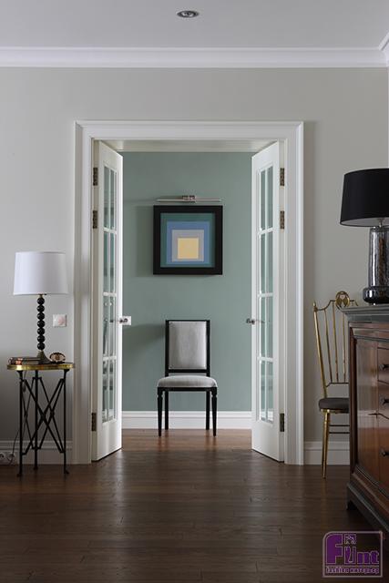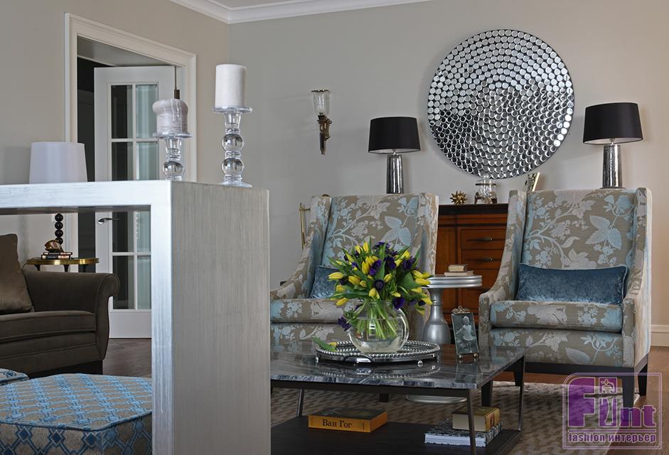 Правильная планировка квартиры позволила устроить немало изолированных помещений: спальню, гардеробные, постирочную, два санузла, кухню, спальню для внучек и гостевую комнаты. За «номенклатурную» роль интерьера отвечает массивная мебель. Французские антикварные стулья из тёмного дерева и современная английская люстра с чёрными плафонами хорошо вписываются в выбранный стиль.
