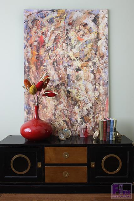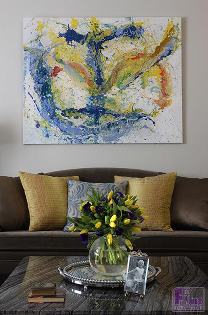 Картина известного уральского художника Михаила Новокщённого из серии «Знаки», украшающая стену в гостиной, собрала различные оттенки интерьера. При вечернем освещении картина «освещает» комнату, как будто сзади неё горят свечи. Цвета с картины закономерно «перешли» на подушки. Ткани на подушках и диване создают игру контрастных фактур: шёлк с орнаментом на одной подушке переходит в вельвет на диване. Вельвет специально перевозили из Таиланда в Бельгию, где заказывали диван.