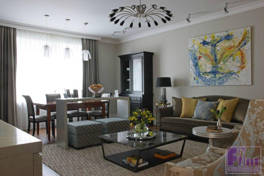 Квартира, с которой дизайнеру предстояло работать, находится в номенклатурном доме на Тверской улице. Заказчики, пожилые люди с положением, продолжают активно трудиться, принимают гостей, у них часто бывают дети и внуки. Поэтому при работе над проектом Ирине предстояло сделать квартиру функциональной. В гостиной, где каждый уголок предназначен для отдыха и расслабления, дизайнер предусмотрела зонирование с помощью лаконичной стойки-консоли. Скромная стойка упрощает процесс приема гостей: ставя на неё блюда, можно не загромождать стол и не ходить за ними лишний раз на кухню.
