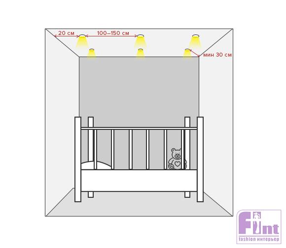 1. Потолочные споты в детской комнате размещайте на расстоянии не менее 20 см от стены и не менее 30 см от угла комнаты, оставляя 100–150 см между светильниками.
