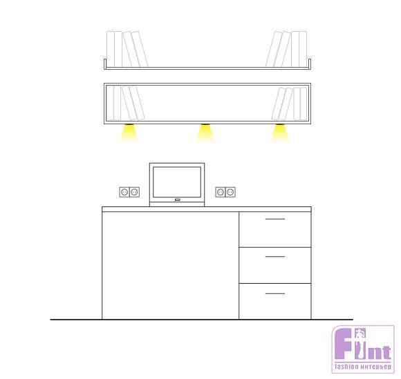 4. Точечные споты или светодиодный линейный светильник, встроенный в навесную полку – отличная замена настольной лампе в детской комнате. Так вы получите мягкий рассеянный свет над всей рабочей поверхностью, и при этом сэкономите место на столе.