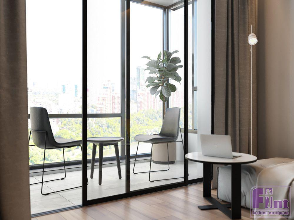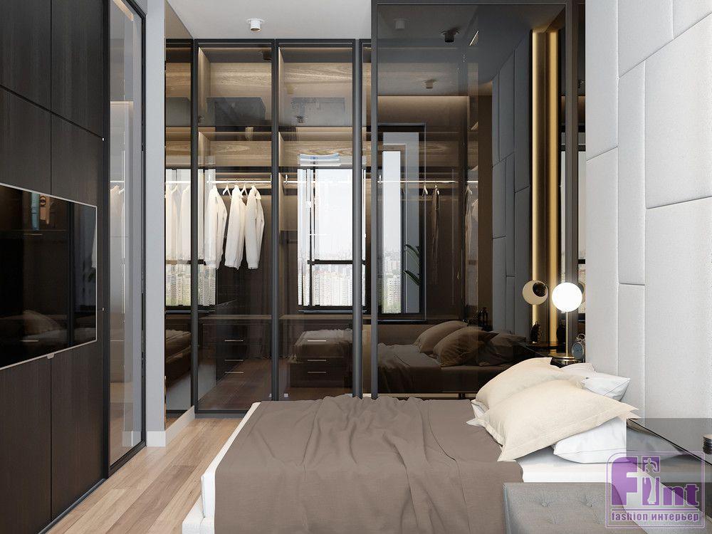 Так появились стеклянные перегородки, отделяющие от гостиной лаунж-зону и спальню. В спальне за стеклом расположили гардеробную. Открытые фасады гардеробной выполнены из стекла родом из Италии (триплекс, «прозрачная бронза»), в изголовье кровати - тканевые стеновые панели. На балконе авторы проекта устроили дополнительную зону отдыха.