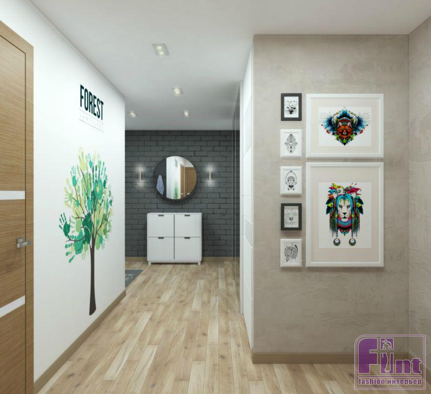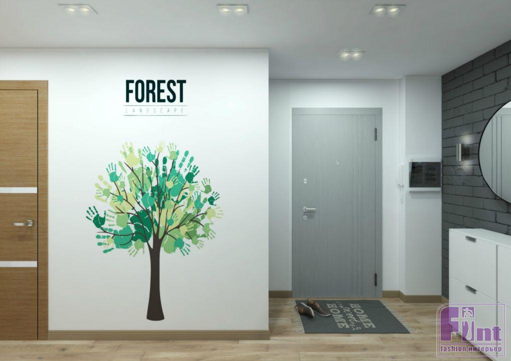 В интерьере присутствует множество элементов с природной фактурой, что сообщает жилью особое тёплое настроение. В каждом помещении, по мысли дизайнера, следовало выдержать природный контекст. Так в квартире появились стилизованные деревья, на стенах прихожей и кухни - надписи, в гостиной - камин с живым пламенем и жизнерадостные яркие картины, передающие атмосферу тепла, уюта и дружелюбия. Также в рамках экостиля появилась акцентная стена, выполненная из серого кирпича.
