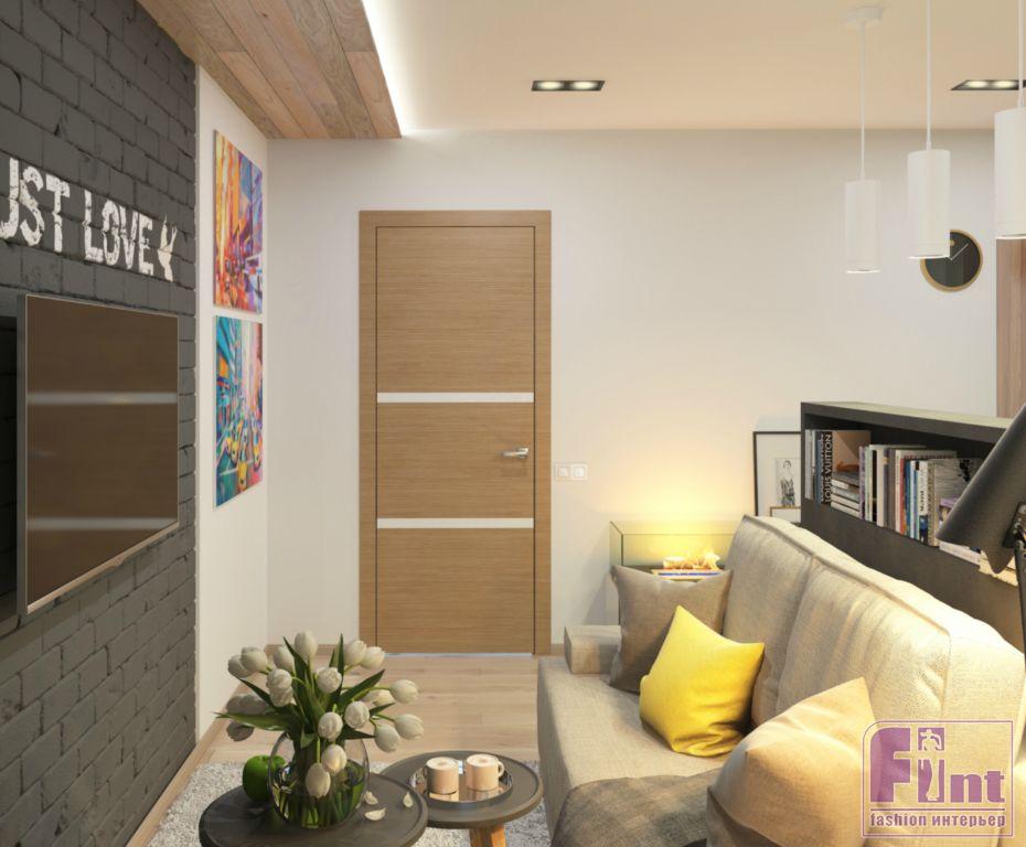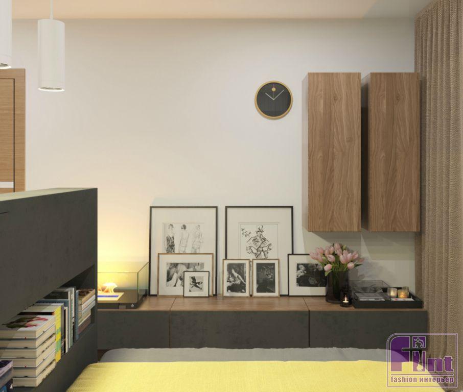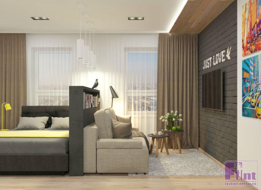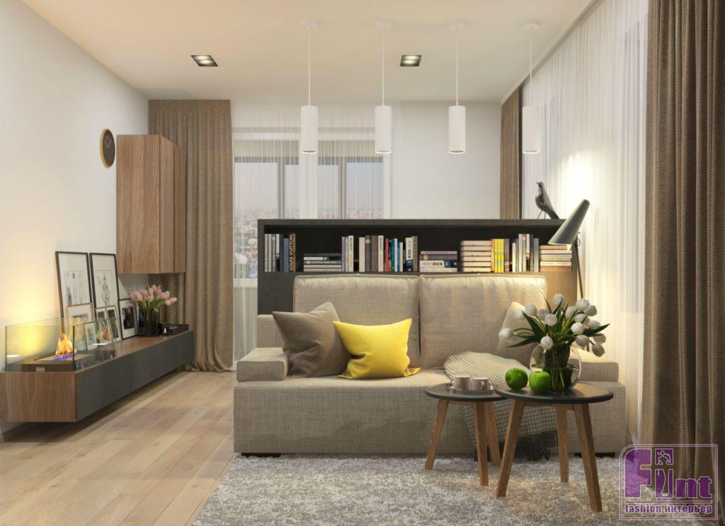 В гостиной дизайнер устроила полноценное спальное место, разграничив помещение с помощью стеллажа. Био камин с настоящим живым пламенем объединил различные функциональные зоны воедино. При этом он отлично вписался в общую экологическую концепцию интерьера.