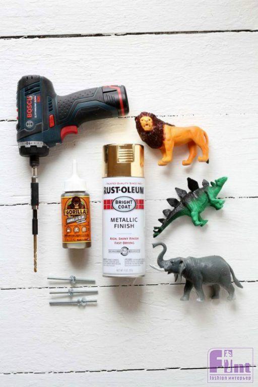 Шаг 3. При желании покрасьте игрушки спрей-краской. Можно оставить и естественный вид, что больше подойдет для детской комнаты. Наиболее выигрышно смотрятся игрушки, окрашенные яркой краской. В нашем варианте мы использовали глянцевую золотую краску, которая прекрасно сочетается с белым рабочим столом и с любой другой белой мебелью. Вы же можете выбрать цвет на свой вкус, или подобрать его в соответствии со стилем и цветовой гаммой вашей комнаты.
