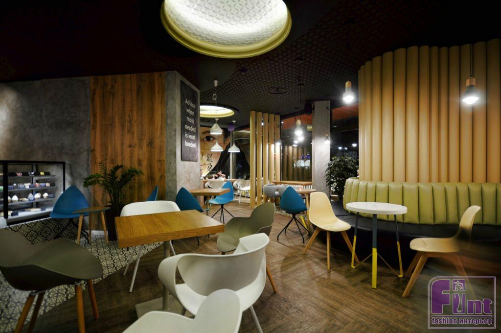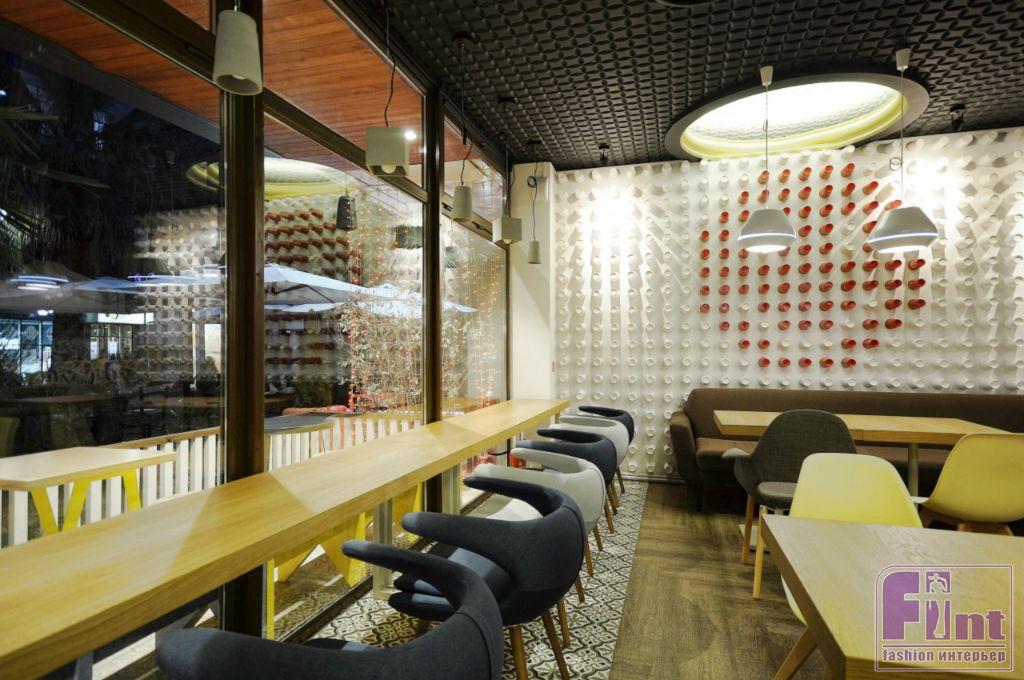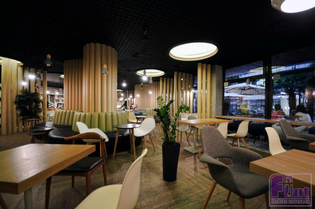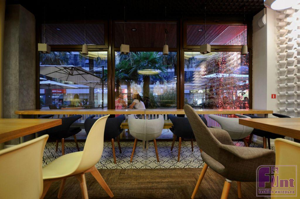 Зал имеет витражное остекление вдоль всего фасада, через которое попадает много дневного света, а в вечернее время, когда включаются освещение, атмосфера в помещении становится более тёплой и уютной. Пространство кофейни общей площадью 190 квадратных метров состоит из различных зон отдыха, предусмотренных как для кофе-брейка, так и для ужина в компании. Что немаловажно, основной зал кафе полностью мобилен и может тркнсформироваться практически под любые задачи.