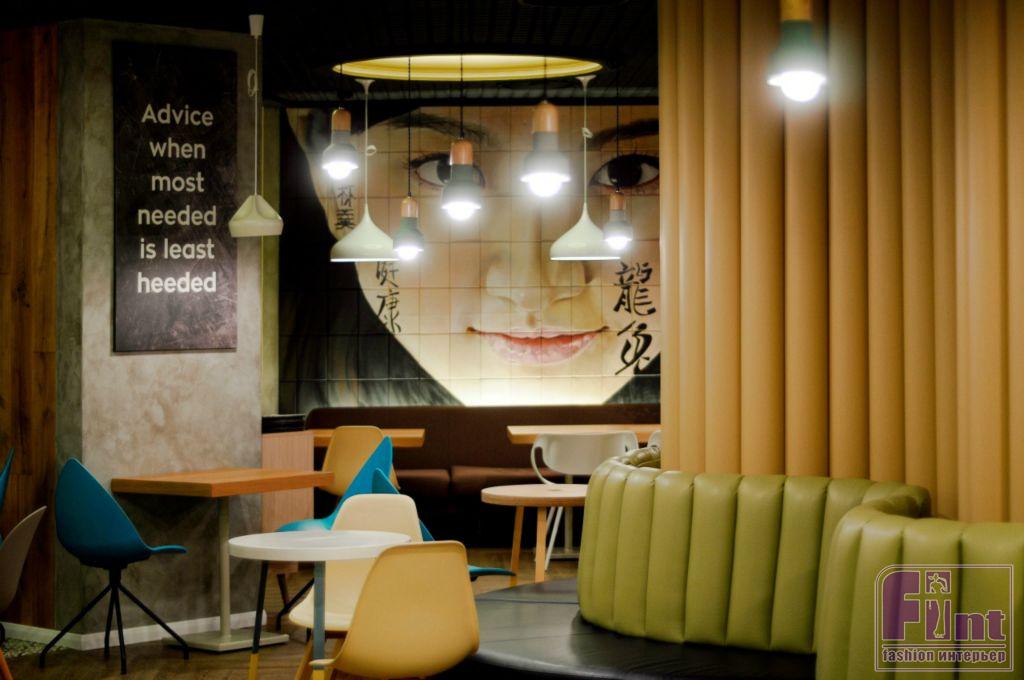 Ретро футуристический интерьер кофейни запоминается сразу. Радиальные колонны с вертикальным ритмом бежевых труб, напоминающих бамбуковые стволы, цветная мебель, стена с панно из фирменных кофейных стаканчиков REDCUP и постоянно меняющимся, благодаря комбинированной подсветке, красно-белым орнаментом. Своеобразную «перекличку взглядов» с этой акцентной стеной ведёт другая поверхность, декорированная прямоугольными плитками с «мозаичным» портретом молодой азиатки. Сам портрет на плитках создавался в Перми, где живёт и работает Артемий Саранин, а затем доставлялся в Сочи. При этом, образ восточной красавицы вовсе не случаен: он не только помогает плавно трансформировать стилизованный смайлик из кофейных стаканчиков на панно в живое лицо и объединить пространство, но и отражает специальные восточные позиции меню кофейни