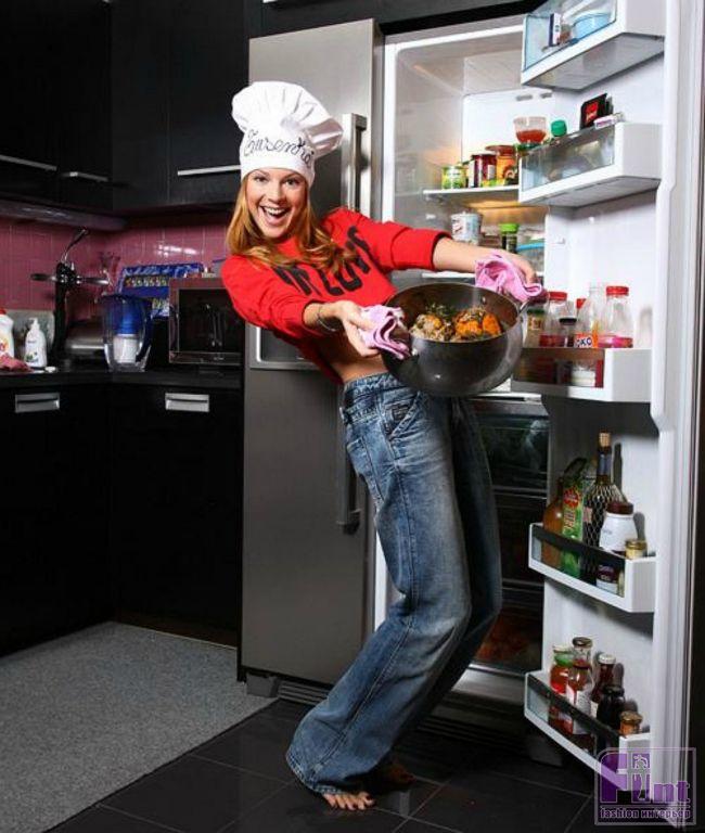Кухня, совмещённая с гостиной, продолжает тенденции общего стилевого решения квартиры. Яркие глянцевые поверхности, стекло и металл. Объединение кухни и гостиной оправдано и очень удобно. По словам хозяев дома, можно в любой момент взять что-то вкусненькое и съесть. Хотя, Наталья признаётся честно, что на кухне она обычно не готовит сложных изысканных блюд. Чаще всего на столе артистов можно увидеть полезную во всех смыслах гречку.