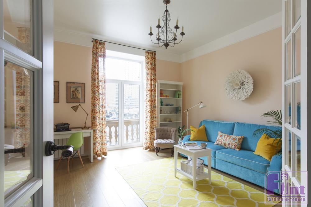 Главенствующей темой в интерьере решено было выбрать флору и фауну. На кухне на неё «работают» разноцветные декоративные тарелки на стене и римская штора с лимонами и гранатами по эскизам Уильяма Морриса. В гостиной внимание приковывает камерунская шляпа Juju hats из перьев и люстра, изящный каркас которой напоминает птичью клетку. Над рабочим местом разместились принты ретро-обложек журнала La Baïonnette, цвета и сюжеты которых перекликаются с отделкой, мебелью и текстилём в комнате.