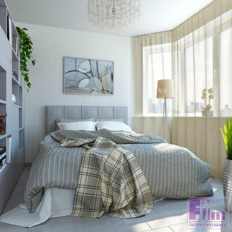Спальню хозяев Софья обустроила в эркерной зоне. От общественной части ее отгородили стеллажом с открытыми полками, позволяющими свету из окна беспрепятственно поступать в гостиную, и закрытыми элементами, в которых можно хранить личные вещи. Кровать выбрали с высоким изголовьем, отделанным тканью. На противоположной стене установили телевизор и модульную систему хранения.