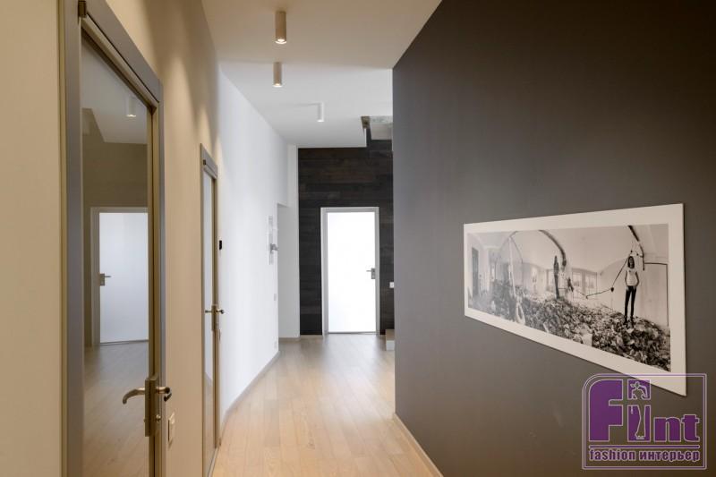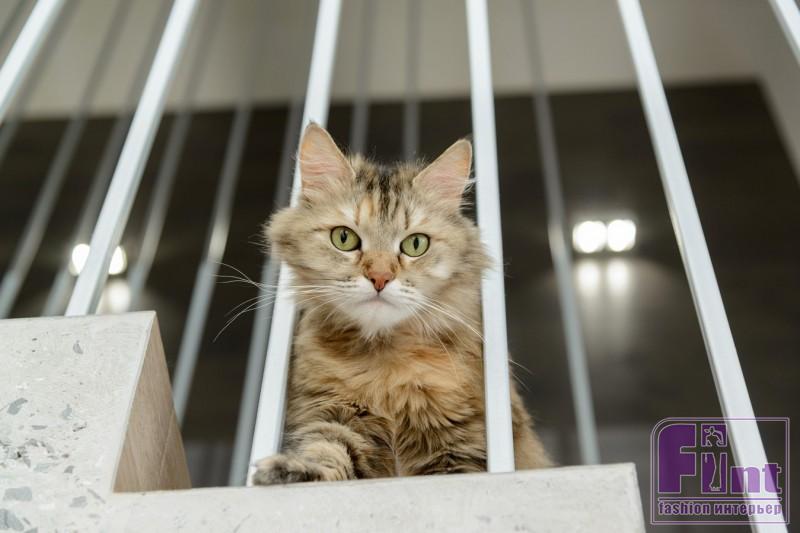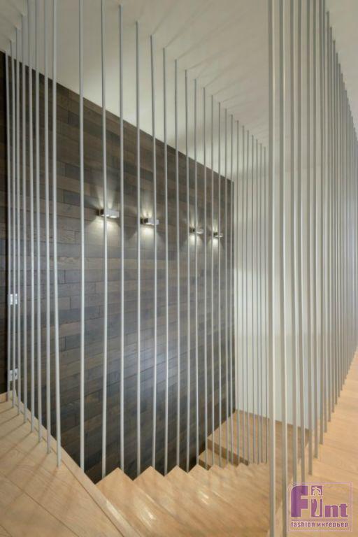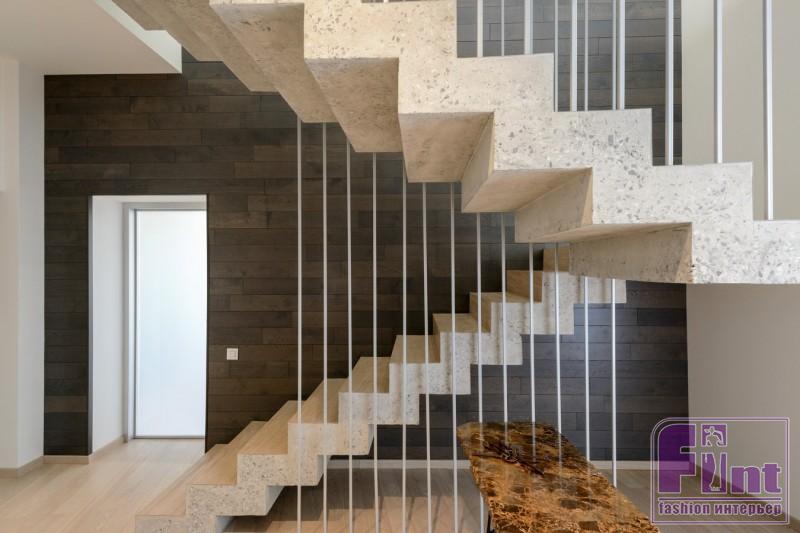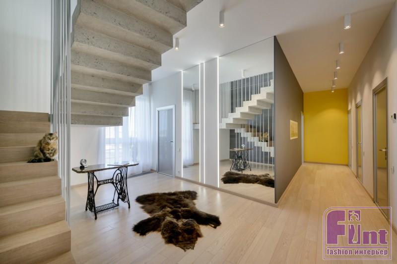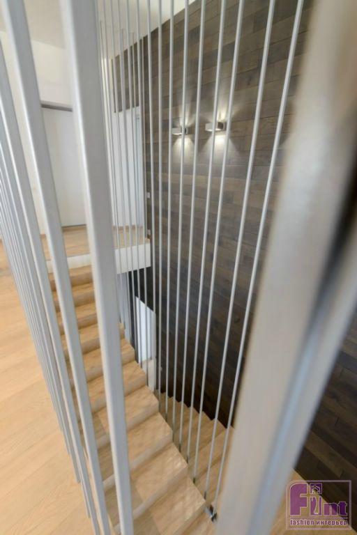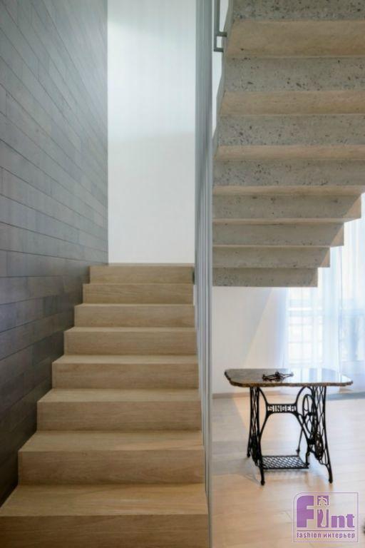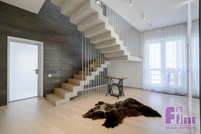 Первый и второй уровни дизайнер объединила с помощью оригинальной лестницы, выполненной прямо в квартире: опалубку выстроили и залили бетоном, затем конструкцию отшлифовали. Лестница обнесена ограждением из полых металлических трубок, сделанных на заказ. Эта необычная и оригинальная лестница, объединяющая два уровня, получилась одновременно брутальной и воздушной, как того хотели заказчики.