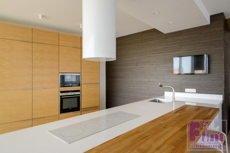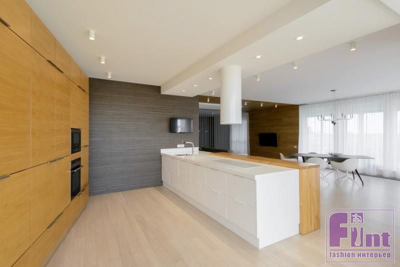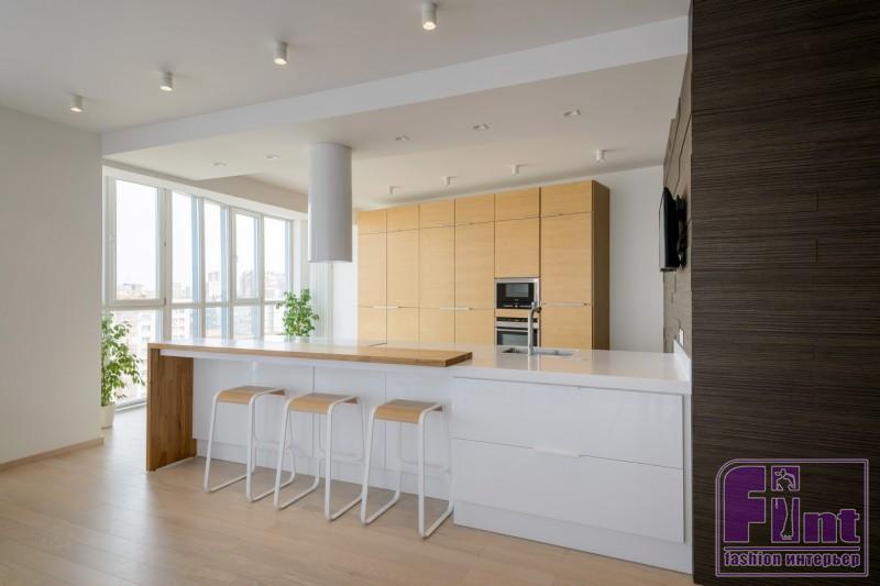 Кухня состоит из острова с примыкающей к нему барной столешницей и модулями, расположенными вдоль одной стены. Лаконичная обеденная группа рядом с окнами стала промежуточным звеном между рабочей зоной и гостиной.