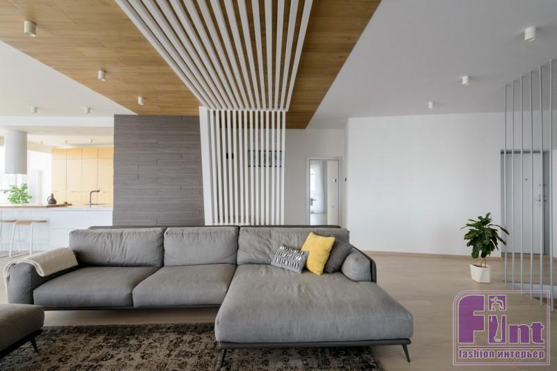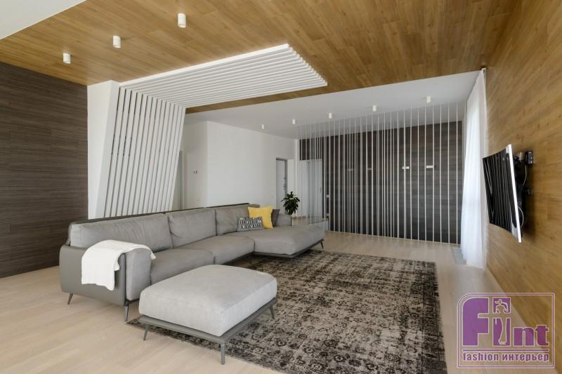 Первый этаж жилища автор проекта отдала под приватные зоны, а на втором разместила большую гостиную, столовую и кухню, объединив их общим открытым пространством. Гостиная получилась светлой и свободной, с хорошим видом из окон. Центр помещения обозначен белыми деревянными брусьями, расположенными под углом. Эта полупрозрачная лёгкая стена задает ритм всему интерьеру и одновременно несёт функциональную нагрузку: она используется как перегородка, за которой начинается зона для отдыха - сауна с мини-бассейном и кинозал.